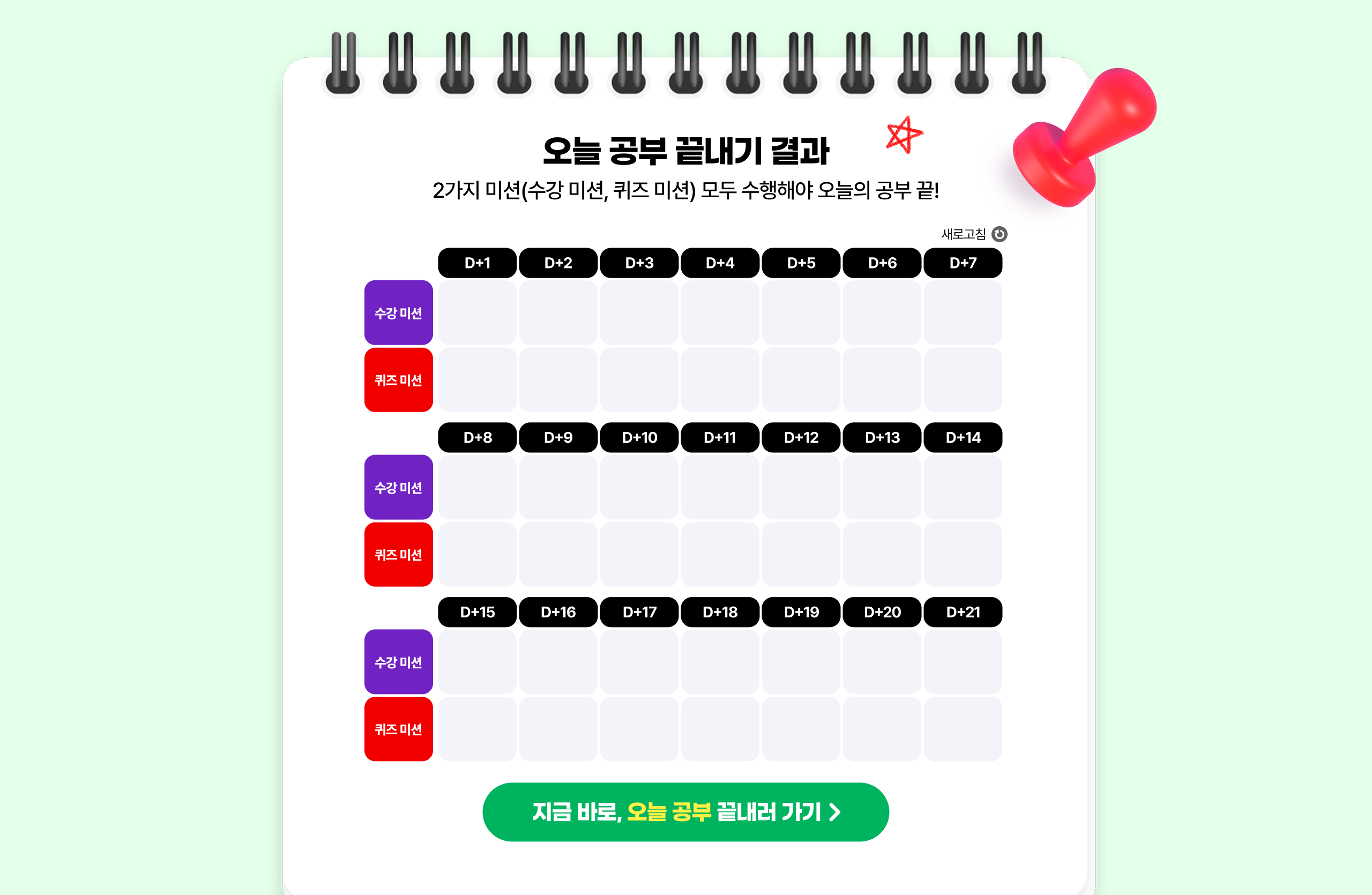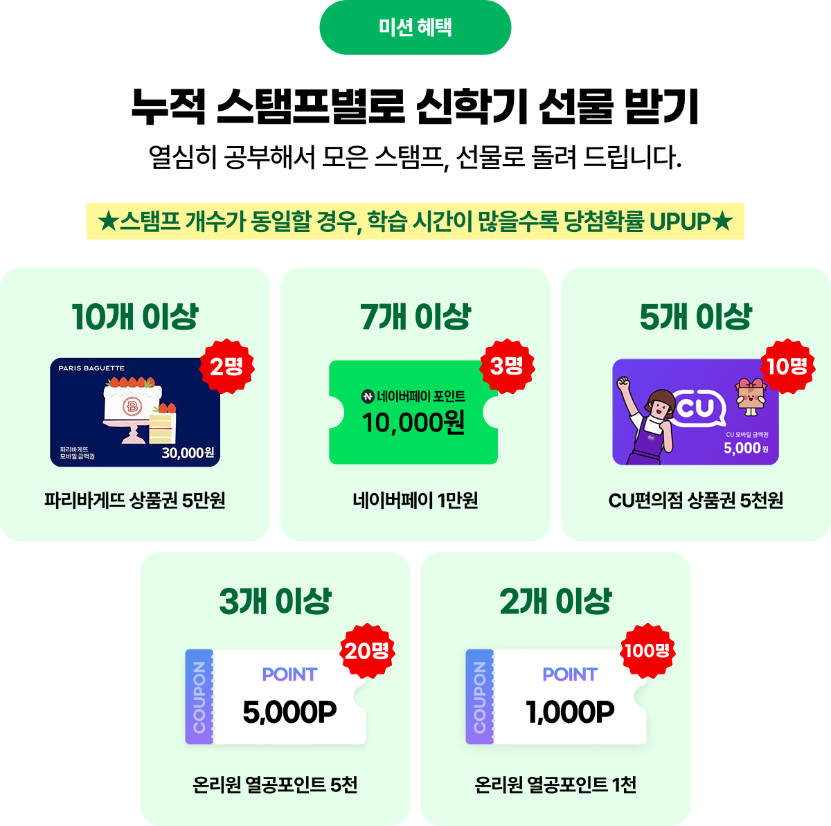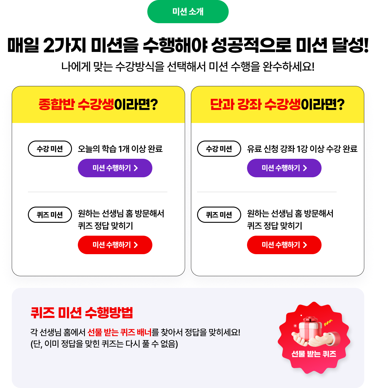 • ¤ý[¼ö°­ ¹Ì¼Ç]Àº Á¾ÇÕ¹Ý È¸¿øÀº ¿À´ÃÀÇ ÇнÀ 1°³ ÀÌ»ó ¿Ï·áÇϰí, ´Ü°ú °­Á ȸ¿øÀº À¯·á ½ÅûÇÑ °­Á¸¦ 1°­ ¼ö°­ÇÏ¸é ¹Ì¼ÇÀÌ ´Þ¼ºµË´Ï´Ù.